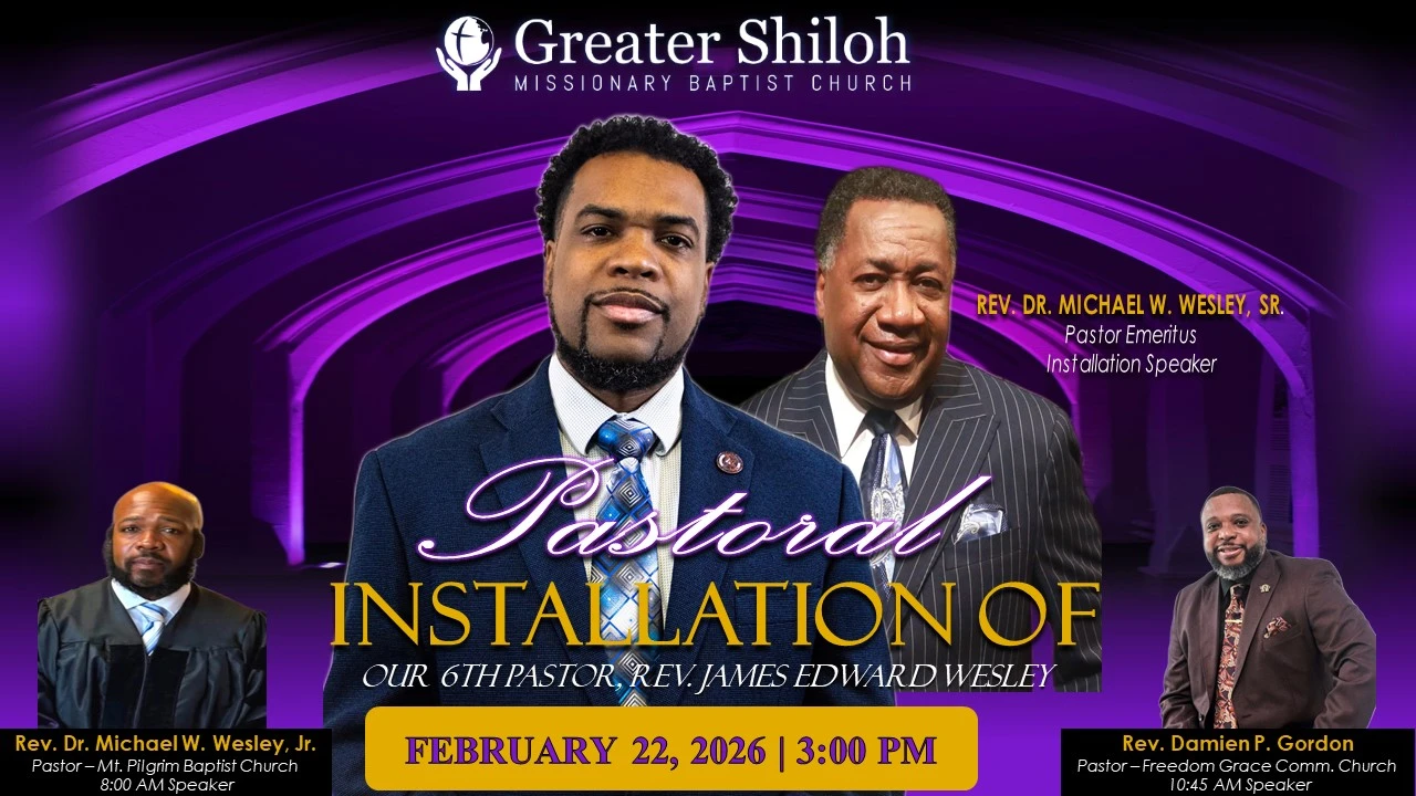 It is with great pride that THE GREATER SHILOH MISSIONARY BAPTIST CHURCH along with its Pastor Emeritus, Dr. Michael W. Wesley, Sr. cordially invite you to join us as we install our 6th Pastor, The Rev. James Edward Wesley on Sunday February 22, 2026 at 3:00 pm. The public is invited to attend.