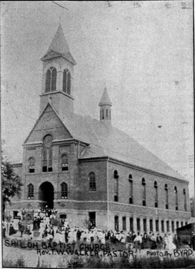 The church that was the marvel of the City of Birmingham was Shiloh Baptist Church under Rev. T. W. Walker. This church was organized May 3, 1891 as a result of preaching supported by a society known as the “Christian Relief Association.” The original structure was one story. Later, the spirit filled young church built on Nineteenth Street and Avenue G. It was a striking structure with a capacity of 3000. At that time, it was the largest congregation in the city. Often when the house was filled to capacity, a good part of the streets were filled with persons who were anxious to approach near enough to hear. Of course the Pastor was the source and center of this successful church. He was fortunate in drawing about him some very business-like people; J. W. Sampson and J. M. Ross.